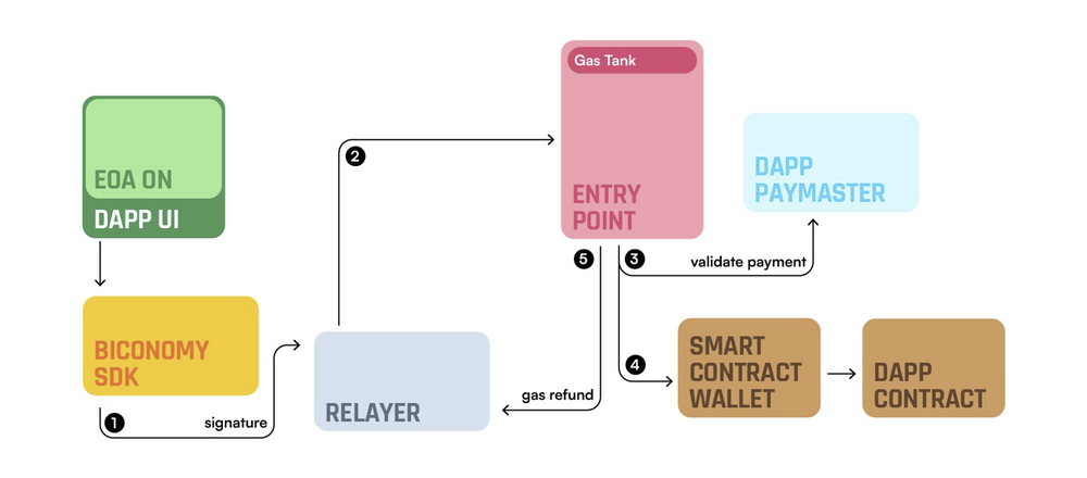 SmartAccount 계정으로 컨트랙트 콜을 하기 위해서는 SmartAccount.execTransaction 를 호출해야 한다. 그렇다면 누가 execTransaction 를 호출하는가? 바로 Relayer다. Relayer는 사용자가 호출 요청한 트랜잭션을 모아 SmartAccount의 execTransaction 를 호출해준다. 정확히는 EntryPoint를 거쳐 호출된다. 이 때, 사용된 Gas는 Relayer 에게 환급된다.