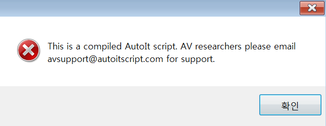 올리 디버거에 올리니 에러가 뜬다. 에러의 내용을 보니 이 프로그램은 AutoIt으로 쓰였다.