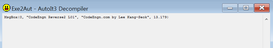 Autoit decompiler를 이용하여 스크립트를 읽어왔다. 맨 뒤의 인자를 보니 13.179, 즉 13179 밀리초 후에 종료된다. 13179를 MD5로 해시하면 DB59260CCE0B871C7B2BB780EEE305DB이다. 즉, flag는 DB59260CCE0B871C7B2BB780EEE305DB이다.