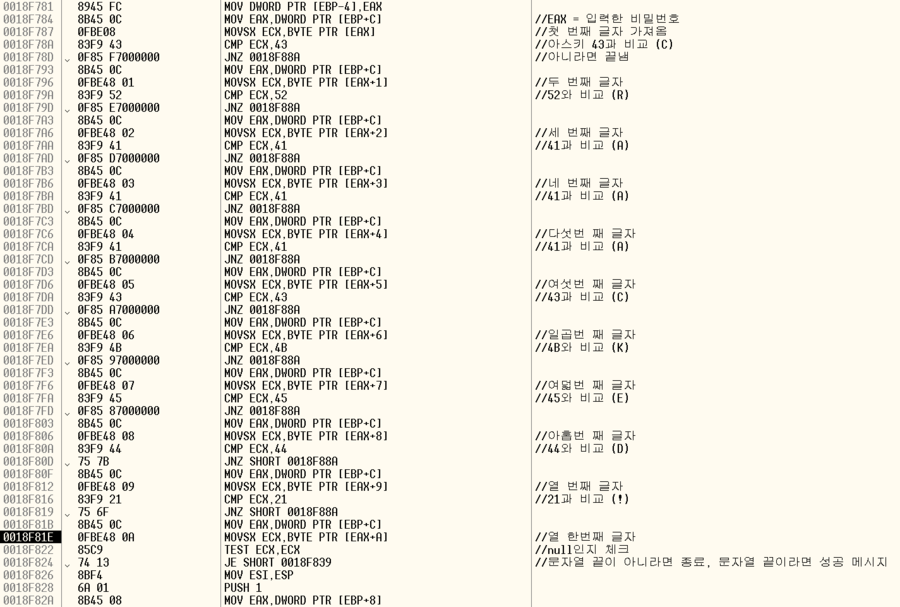 문자열 비교 함수를 쓰지 않고 직접 한 글자씩 비교한다. 비밀번호는 CRAAACKED! 이다.
