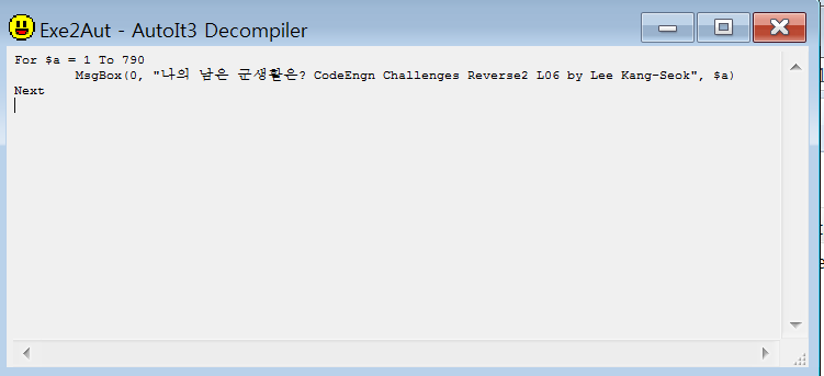 Autoit 디컴파일러를 이용하여 디컴파일 했다. a가 790이 될 때까지 반복한다.