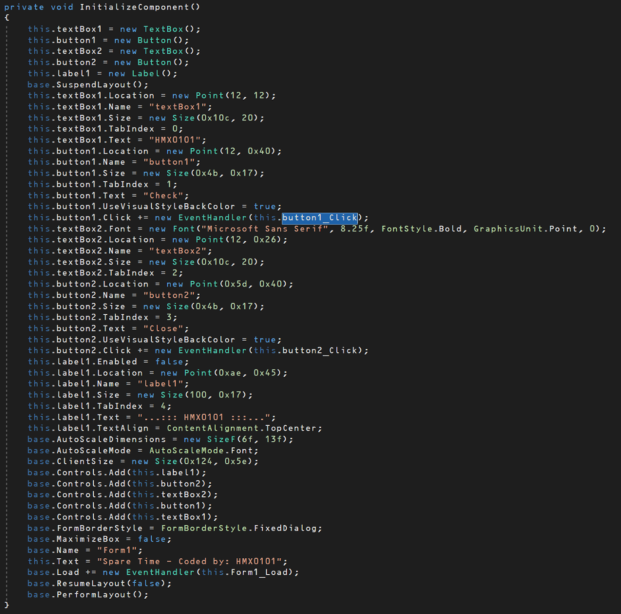 이것저것 초기화한다. Check 버튼을 눌렀을 시 호출되는 핸들러를 보면 시리얼 알 수 있을 것 같다. 이벤트 핸들러로 등록 된 button1_Click 함수를 보았다.