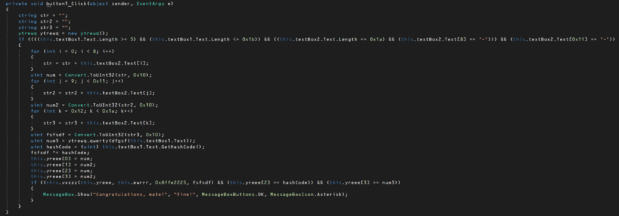 이것저것 연산한 뒤 적절한 시리얼을 입력했을 때 성공 메시지를 띄운다. 코드를 자세히 보자.