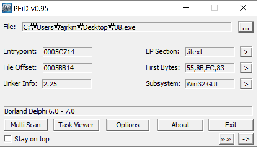 PEiD로 조회해보니 델파이로 짜여진 프로그램이라고 한다.