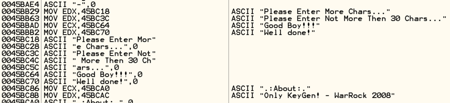 문자열 찾기로 에러 메시지를 찾았다. 근처에 성공 메시지도 보인다. 이 프로그램은 name 입력 값을 이용해 key를 생성하고, 이를 입력한 key와 비교하는 프로그램이다.