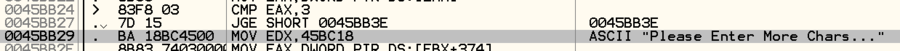 name의 길이가 3 이하일 경우 더 긴 입력을 요구한다. 문제의 힌트에서 2글자의 알파벳 또는 숫자로 이루어졌음을 알려준다. 따라서 3글자 조건을 우회하기 위해 JGE를 JMP로 바꾸었다.
