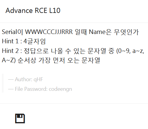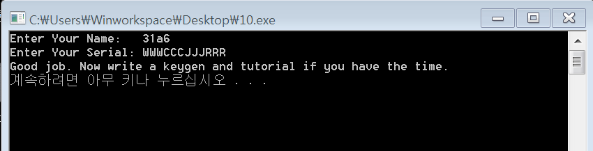 }이 조건이라면 이름과 키를 같게 한다면 무조건 통과할 수 있다. 다른 글자를 섞으려면 이름 한 글자 당 세 글자의 시리얼을 쓰면 쉽다. WWWCCCJJJRRR은 3글자씩 동일하기에, name이 각 글자와 같다면(wcjr) j를 인덱스로 하는 for문을 쉽게 통과한다.