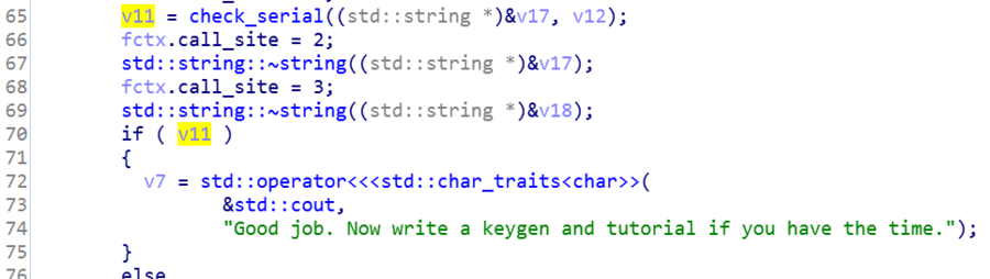 IDA의 헥스레이를 이용해 디컴파일한다. v11 변수에 성공 여부가 저장된다. 이는 check_serial의 리턴값이다.