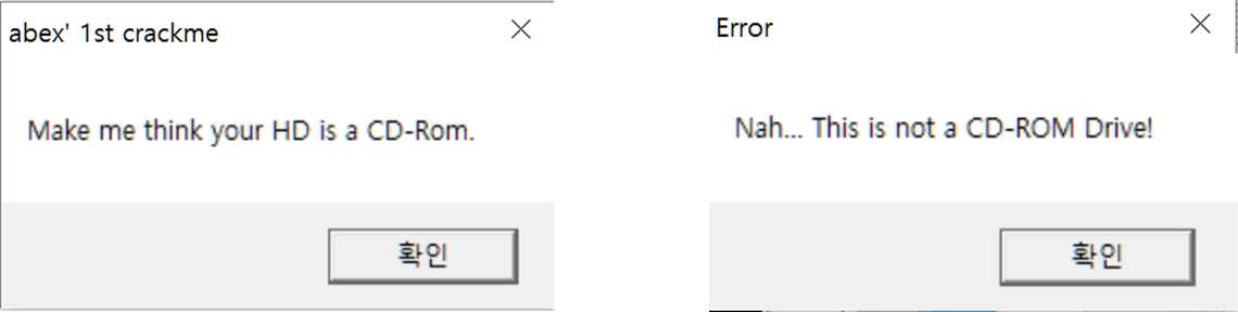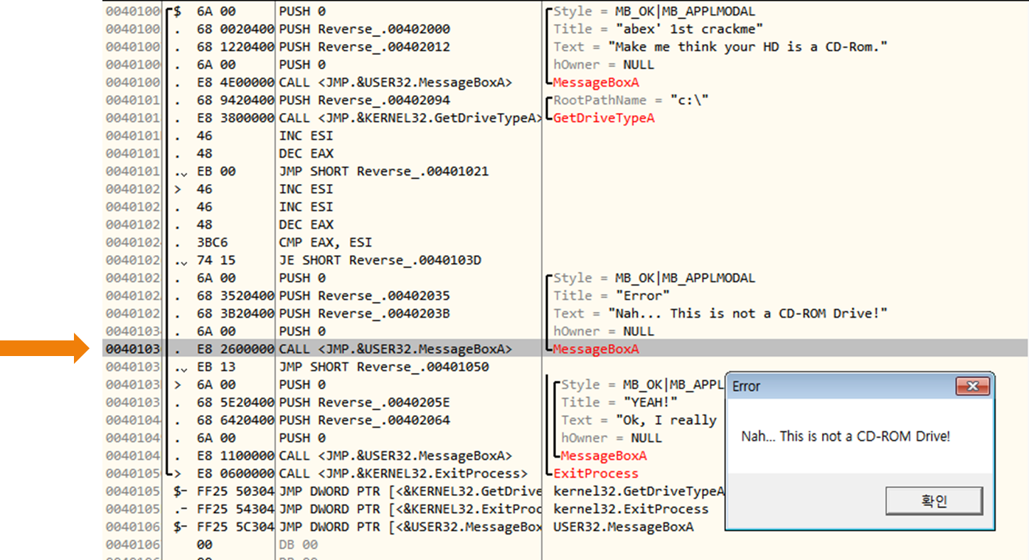 올리디버거에 올려 차근차근 실행해본다. 어느 코드에서 왜 창이 뜨는 지를 찾아보자.