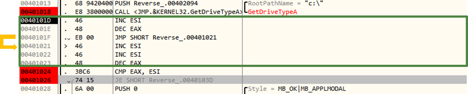 GetDriveTypeA 함수와 CMP코드 사이의 코드이다. ESI를 총 3만큼 더하고, EAX를 총 2만큼 뺀다. 중간의 점프는 바로 아래 있는 코드로 점프한다. (리버서를 헷갈리게 만드는 더미 코드로 보인다)