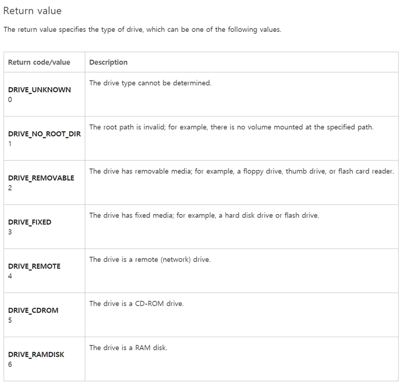 GetDriveTypeA함수가 Kernel(OS)과 관련이 있어 보여 인터넷 검색을 했다. 그러자 리턴값에 대한 정보를 찾을 수 있었다.