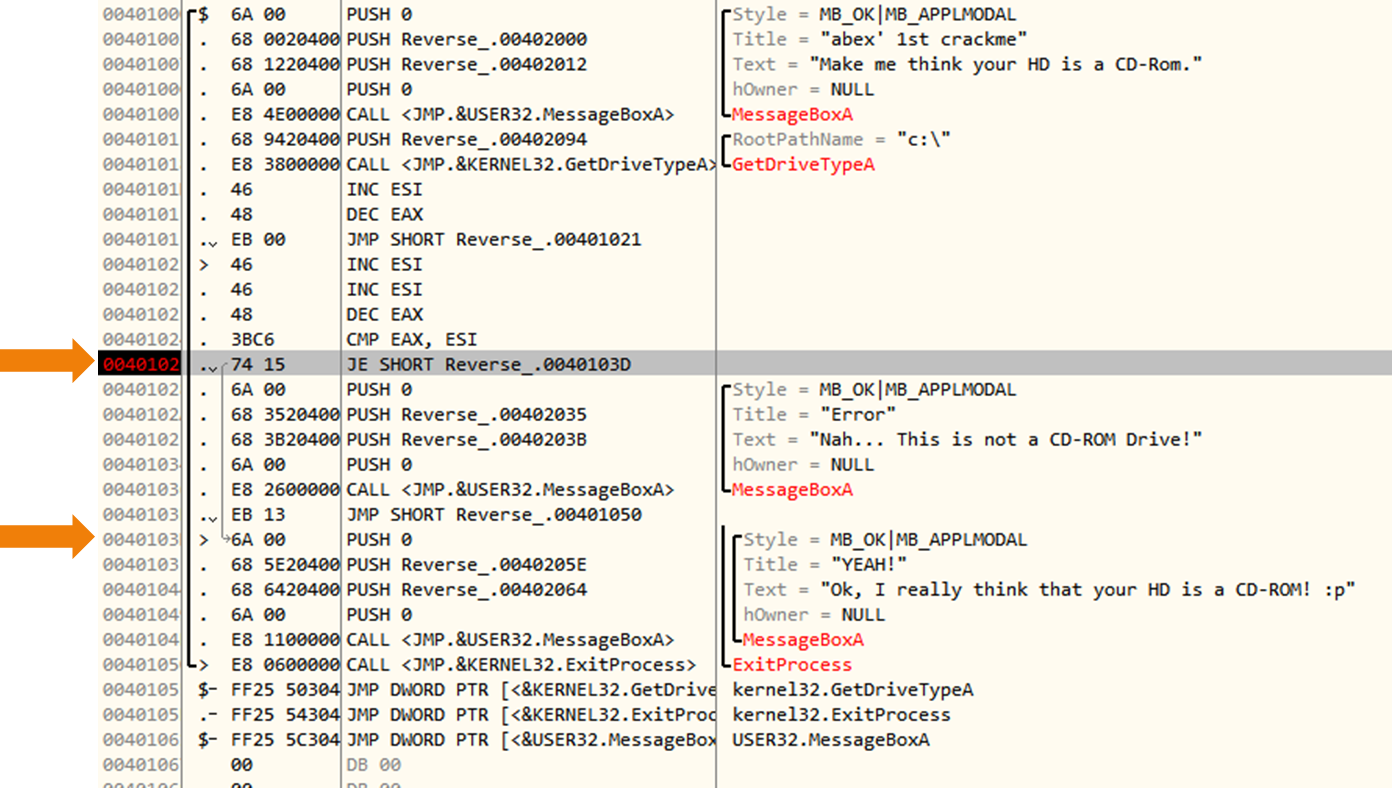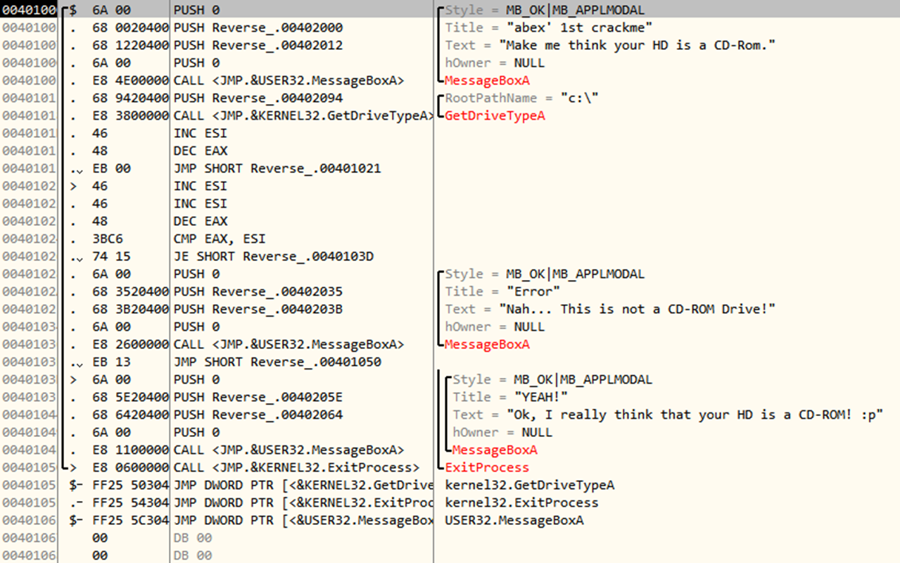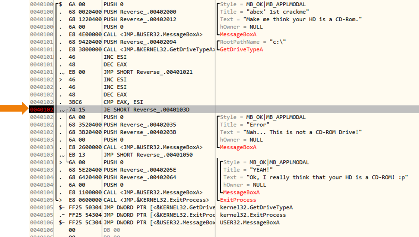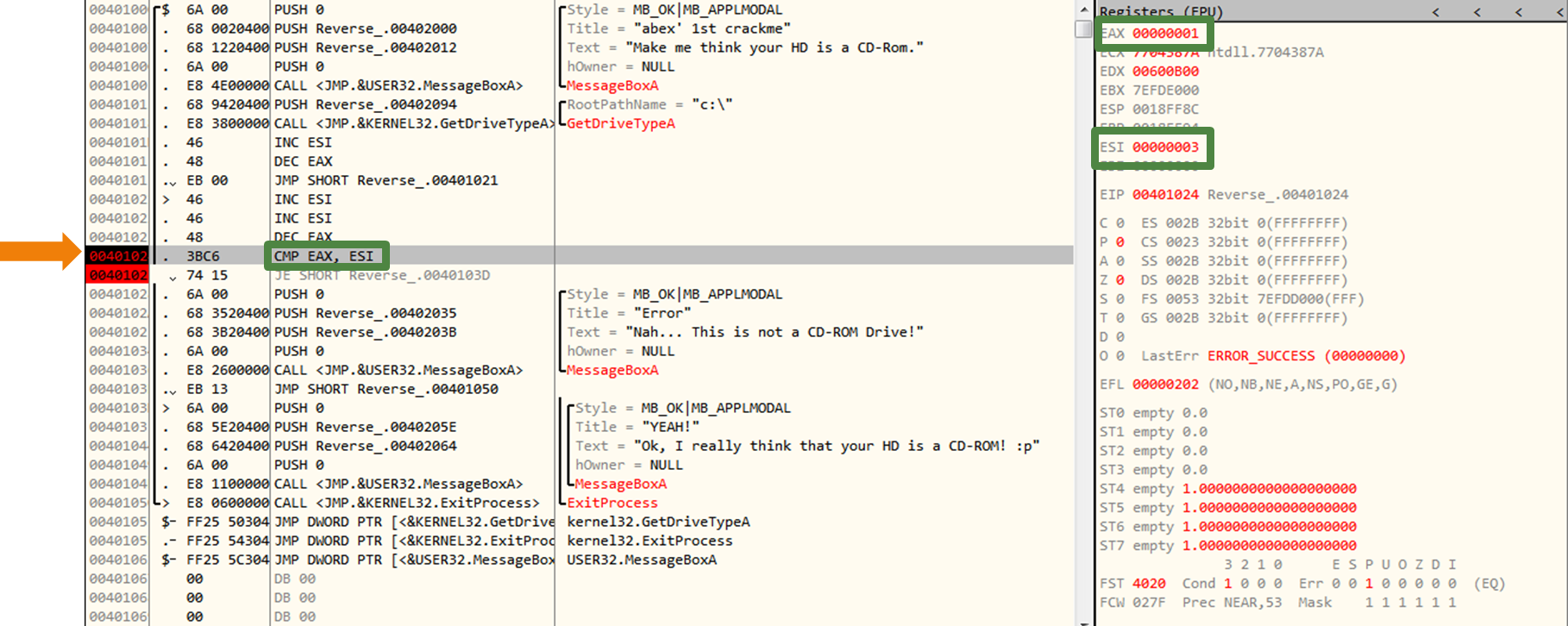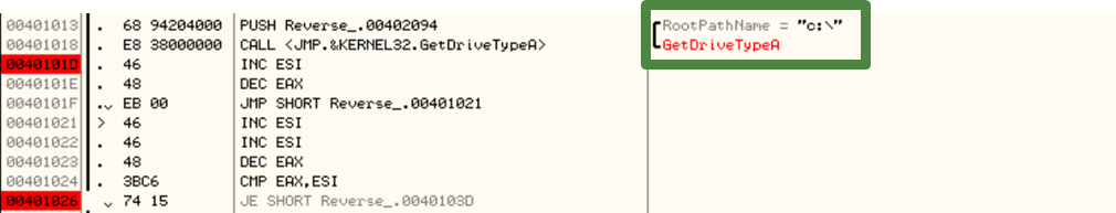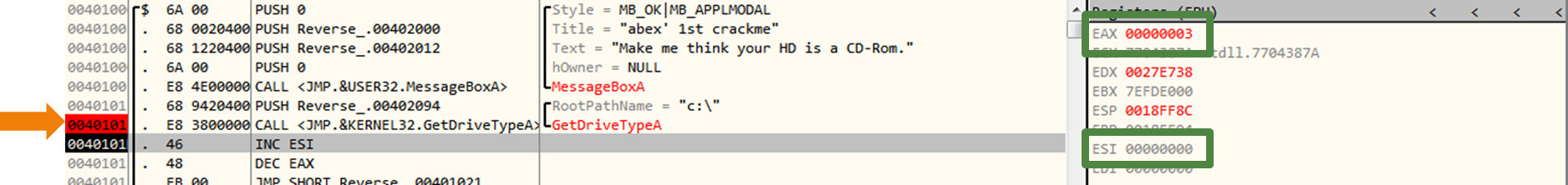 CMP를 실행하기 전 GetDriveTypeA 함수를 실행하여 EAX가 3으로 설정된다. ESI는 처음부터 0이였다.