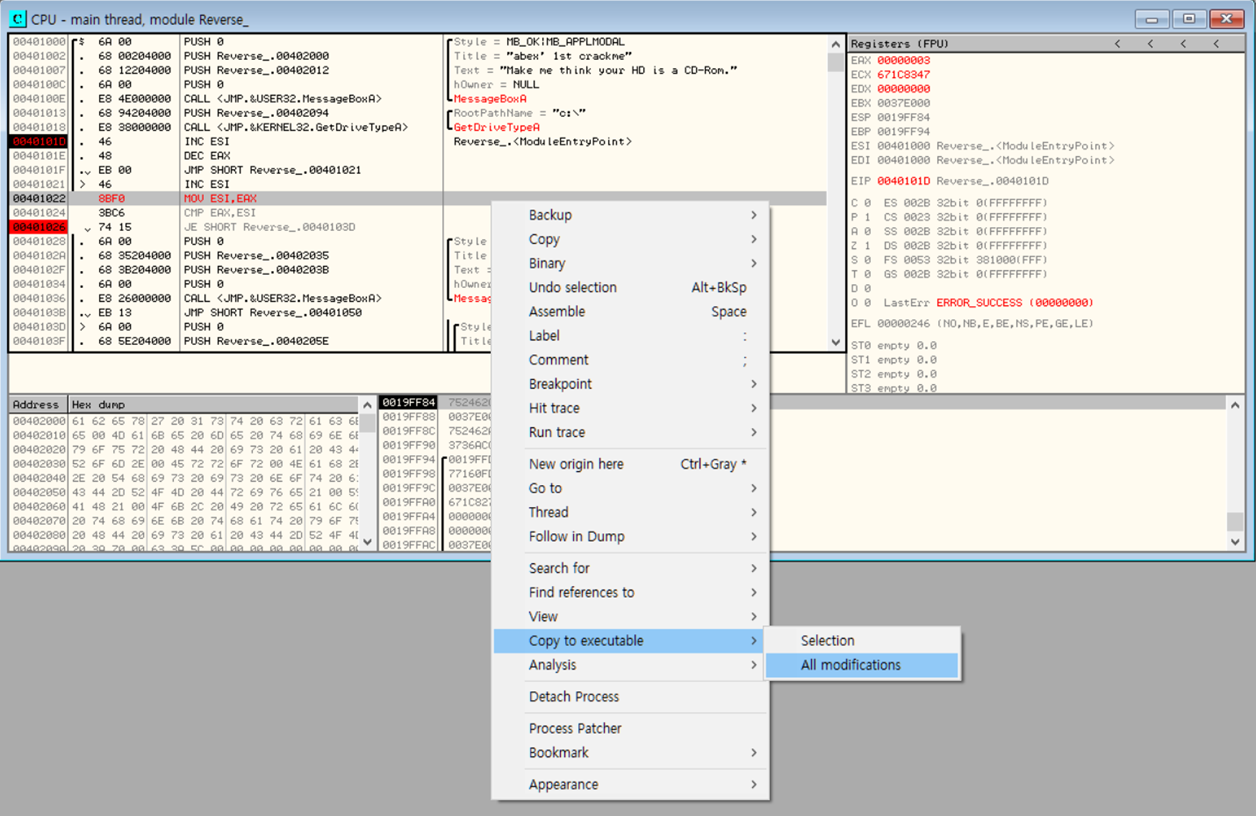 수정한 EXE를 저장해 새로운 EXE 파일을 만드려면 다음과 같이 하면 된다.