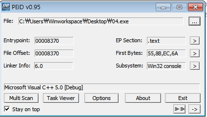 올리디버거로 돌리기 전에 간단히 PEiD로 확인해 보았다. [Debug]가 신경쓰이지만, 딱히 패킹은 안 되어있는 듯 하다.