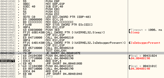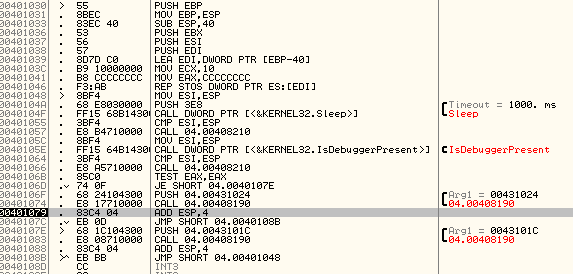 함수를 자세히 들여다 보자. 일단 진행시켜 보았더니, 커서가 멈춰있는 바로 위 줄이 호출되면 “디버깅 당함”문자열이 출력된다. 함수에 push하는 인자를 메모리 덤프에서 찾아보았다.
