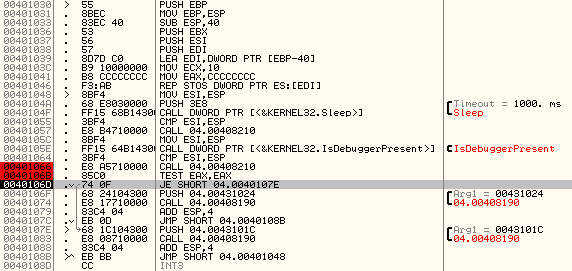 점프를 바꾸거나 없어도 될 것 같은 CMP ESI와 ESP + Call 04.00408210에 적당히 EAX의 값을 0으로 바꾸는 코드를 넣으면 디버깅을 하고 있으면서도 “정상”을 출력할 수 있다.