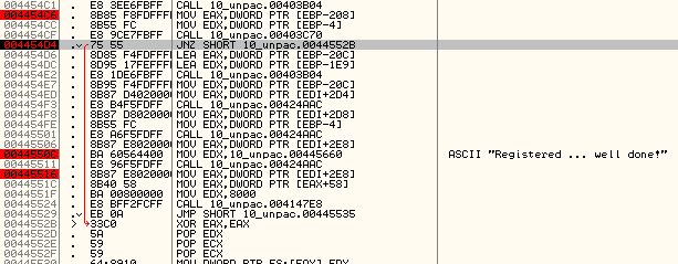 분기하는 부분은 성공 메시지의 조금 위에서 찾을 수 있다. JNZ이니 위에서 cmp하는 부분이 있을 것 같다.