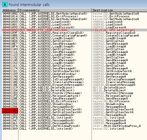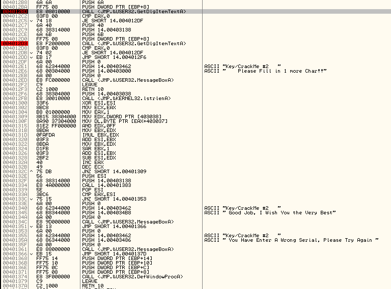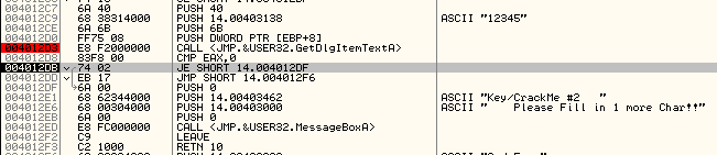 GetDlgItemTextA 함수는 받아온 string의 길이를 반환한다. GetDlgItemTextA로 반환된 값(EAX)과 0을 비교한 뒤 같으면 에러 메시지를 띄우는 루틴이 있다.
