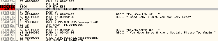 성공 메시지 출력 분기를 찾았다. EAX와 ESI를 비교하고, 같지 않을 시 오류메시지를 낸다. 비교하는 값이 무엇인지 추적해보았다.