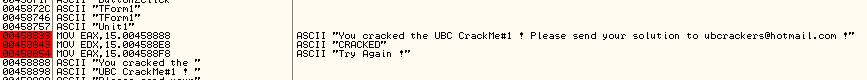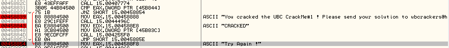Try Again문장에서 bp가 걸렸다. 빨간 화살표를 보니 위에서 JNZ로 분기함을 알 수 있다. 그 위에서 CMP로 EAX와 45B844 주소의 값(DWORD)을 비교한다. 메모리 덤프와 레지스터 값을 확인해 보았다.