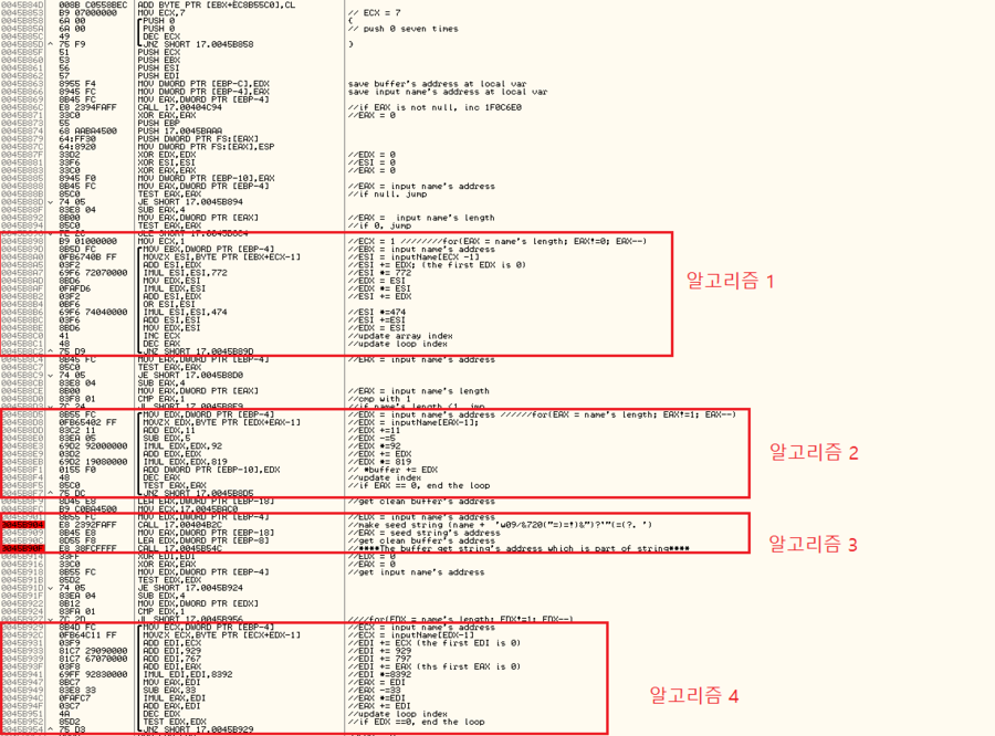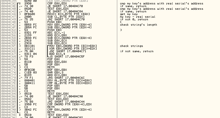 input과 serial의 주소를 같게 준 것이 아닌지 체크를 하는 루틴이 눈에 띈다. 또한 그냥 비교하는 것이 아니라 주소를 한 번 꼬아서 비교하는 점도 특이하다. 비교하는 함수보다는 serial을 만드는 부분이 궁금하니 이 정도만 분석하고 넘어가자.