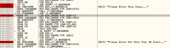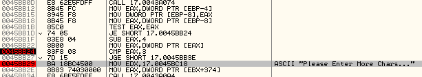 referenced text에서 찾은 문자열이다. 에러 문구를 참고하면 글자 수에 제한이 있는 것 같다. 일정 수 이상의 글자여야 하며, 30자 이상도 오류메시지를 낼 것 같다. 문자열 참조 코드에 bp를 걸고 실행해보자.