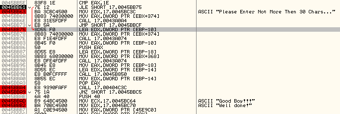 에러 메시지 분기에서, 에러메시지를 내지 않는 경우의 코드를 분석해보았다. 분석 결과 앞의 please enter more chars 에러에서 분기하기 전 하는 일과 똑같은 일을 한다는 것을 알아냈다. 마지막에는 name의 길이를 받아와 0x1E(10진법으로 30)과 비교한다.