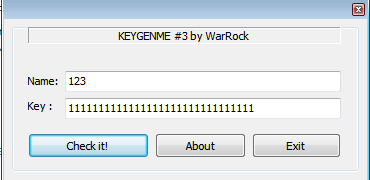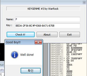 에러 메시지에 bp를 걸고 name에는 1, key에는 123을 입력한 뒤 실행했다. 바로 위에 분기문이 있어 위의 cmp에도 bp를 걸었다. cmp 바로 위에서 EAX가 가리키던 주소의 값을 읽어 3과 비교한다.