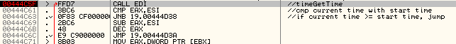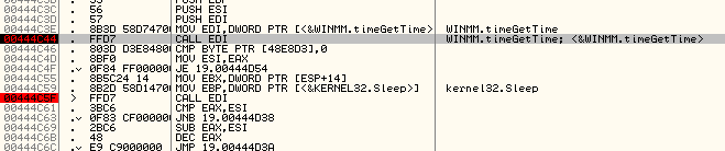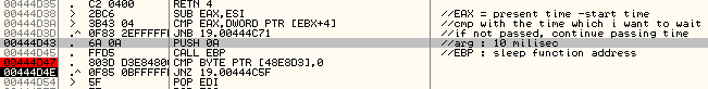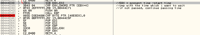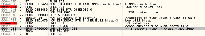 주석에 분석을 썼다. timeGetTime 함수에서 리턴한 시스템 시간값은 ESI에 백업해두고, sleep한 뒤 다시 시간을 구한다. 그 두 값을 비교하여, 현재 시간이 더 크거나 같으면 점프한다.