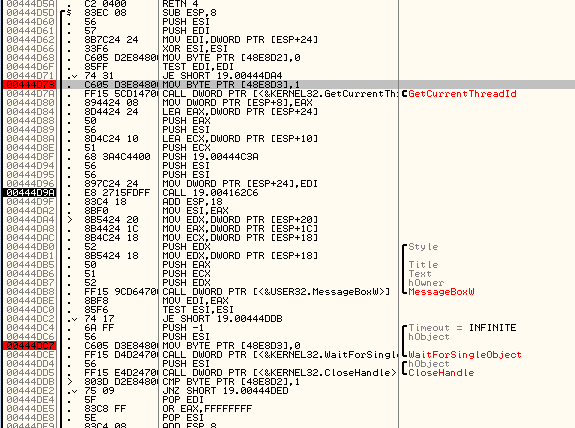 위 bp에서 48E8D3에 1을 넣고, 아래 bp에서는 0을 넣는다. 0을 넣은 후 바로 WaitForSingleObject를 호출한다.