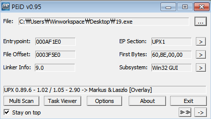 PEiD에 넣어보았다. UPX 패킹이 되어있다. 패킹을 해제하고 올리디버거로 돌려보았다.
