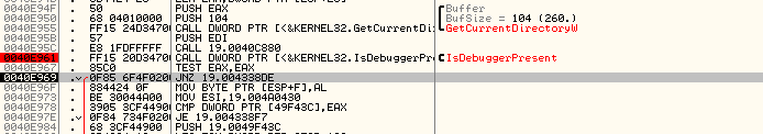 그래서 분기하는 코드를 찾아 올라갔다. 위에서 IsDebuggerPresent 함수로 디버깅중인지 체크한 후, 디버깅중이라면 점프하여 에러를 낸다.