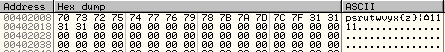 인자로 넣은 주소는 402008이다. 메모리 덤프에서 주소를 찾아보았다. 뒷쪽에는 입력값의 일부가 보인다. 앞 부분은 앞서 호출된 함수에서 시리얼을 만들며 변형된 값이다.