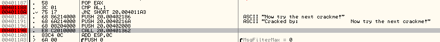 즉, 바로 위에서 EAX와 4020F9의 내용을 비교했을 때 같으면 AL이 1이 된다. 그 후 AL을 TEST한다. AL이 0이면 점프하고, 0이 아니면 점프하지 않는다. 즉, EAX와 4020F9의 내용이 같을 시 점프하지 않는다.
