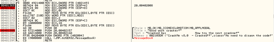 EDI에도 스택에 저장된 값을 넣는다. ESP + 8 에 저장된 값은 Cracked by~ 문장이 적힌 주소이다.