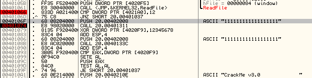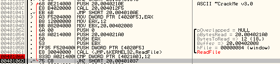 파일을 연 후 ReadFile을 호출한다. 인자로 4021A0 주소를 넣는데, 이는 lpNumberOfBytesRead 파라미터로, 파일에서 읽은 글자 수가 저장될 주소이다. nNumberOfBytesToRead 파라미터로 0x12를 넣어 최대 0x12(18) 바이트를 읽게 한다. 읽은 후 바로 4021A0 주소에 저장된 값과 0x12를 비교한다. 파일 크기(바이트)가 0x12보다 작다면 위의 이미지처럼 점프한다. 점프한 코드는 에러 화면을 띄우는 코드이다.