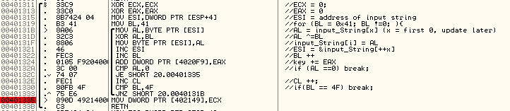 스택에 저장된 402008를 ESI에 넣는다. 402008에는 입력값이 있었다. 이 값은 키를 만드는 함수에서, A~O와 XOR된 값으로 수정되었다.