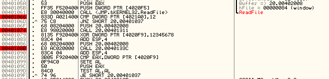 그 밑에서는 4020F9의 내용과 0x2345678를 XOR한다. 조금 더 진행하면 EAX와 4020F9의 내용을 비교하고, SETE AL 명령어를 실행한다.