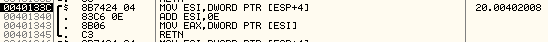 아주 짧은 함수이다. 함수에 인자로 넣어준 주소를 ESI에 넣고, 그것에 0x0E를 더한 주소에 있는 내용을 EAX에 가져온다.