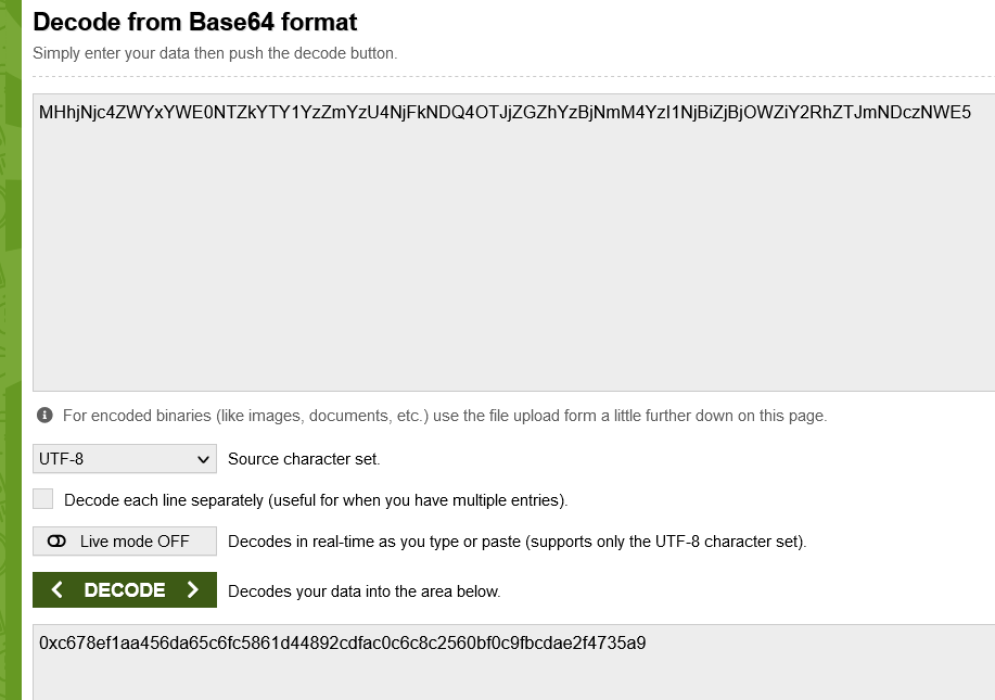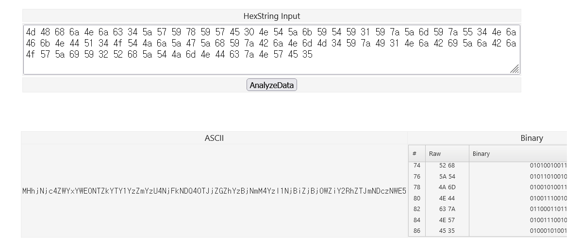 4d 48 67 79 4d 44 67 79 4e 44 4a 6a 4e 44 42 68 59 32 52 6d 59 54 6c 6c 5a 44 67 34 4f 57 55 32 4f 44 56 6a 4d 6a 4d 31 4e 44 64 68 59 32 4a 6c 5a 44 6c 69 5a 57 5a 6a 4e 6a 41 7a 4e 7a 46 6c 4f 54 67 33 4e 57 5a 69 59 32 51 33 4d 7a 59 7a 4e 44 42 69 59 6a 51 34바이트를 문자열로 변환하면 MHhjNjc4ZWYxYWE0NTZkYTY1YzZmYzU4NjFkNDQ4OTJjZGZhYzBjNmM4YzI1NjBiZjBjOWZiY2RhZTJmNDczNWE5 가 나온다.
