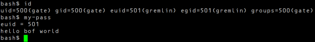 my-pass를 이용하여 gremlin의 비밀번호를 알 수 있다. gremlin의 비밀번호는 hello bof world 이다.