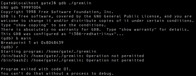 이 때, 다른 소유자의 프로그램은 gdb를 이용할 수 없으므로 /tmp 폴더에 복사해야 한다.