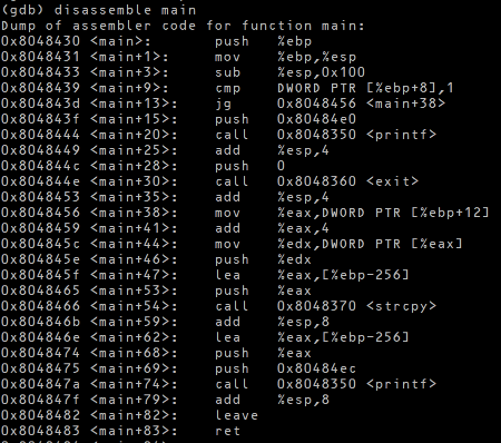 - strcpy 함수 인자로 ebp-256 을 넣음 ( = ebp-0x100)