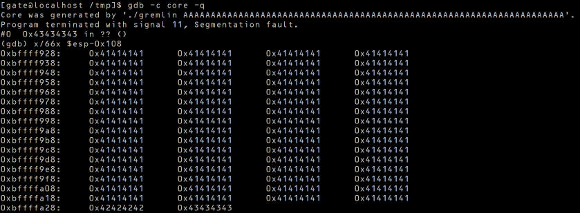 return address에 유효하지 않은 값을 넣어주면 core dump하게 된다. 버퍼 100개엔 “A”를, EBP backup자리에는 “B”를, return address 자리에는 “C”를 넣었다.