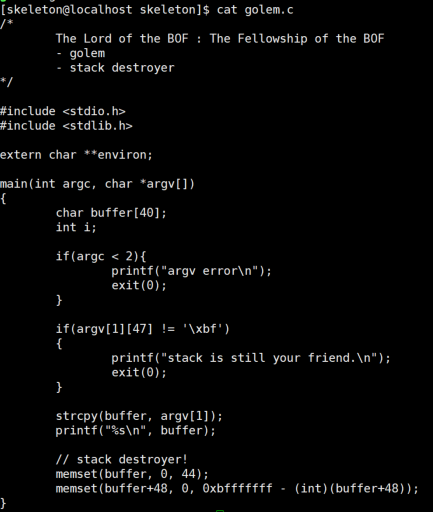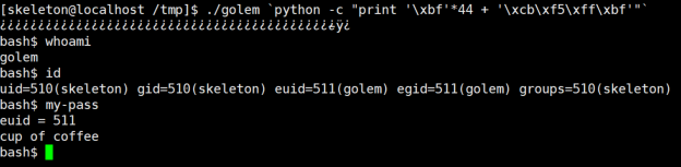 위에서 찾은 주소를 이용하여 셸 코드를 실행하도록 하였다. golem의 비밀번호는 cup of coffee 이다.