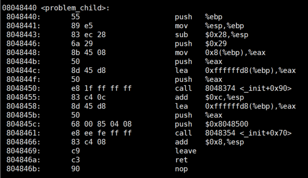 실제로 problem_child 함수에서 어디까지 덮어 쓸 수 있는지 확인하였다. EBP 백업의 1바이트를 덮어쓴다는 것을 확인할 수 있다. EBP backup의 하위 1바이트를 조작하므로, 0xxxxxxYY 형태의 주소가 된다. YY부분에 조작된 값이 들어간다.(리틀 엔디안) 상위 3바이트는 조작되지 않으므로 기존 EBP backup인 스택 영역의 주소가 있다. 즉, 셸코드는 스택 영역을 이용해야 한다.