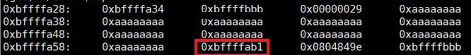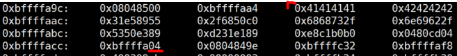 그리고 0xbffffacc위치에는 1바이트 오버플로우를 통해 이번 테스트에서 0x41414141를 입력한 위치(새로운 ebp backup 주소가 있는 위치)를 적어야 한다.