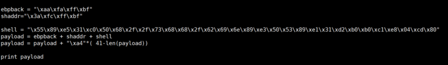 strncpy로 복사된 스택의 주소를 core파일을 이용하여 알아냈다. 값은 0xbffffaa4부터 시작된다. 첫 4바이트에는 새로운 ebp backup을, 두번째 4바이트에는 셸 코드의 주소를 넣어야 한다.