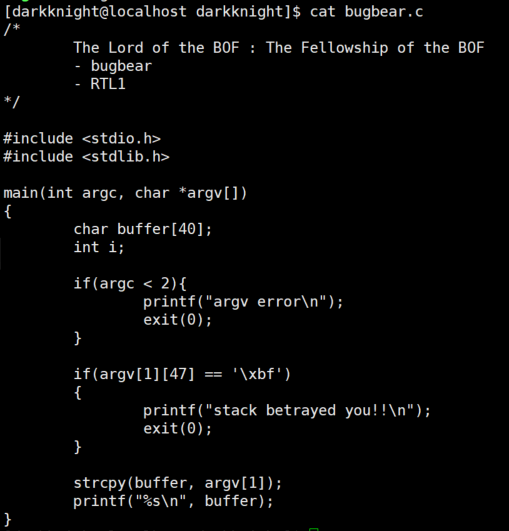 argv[1]을 buffer에 복사한다. overflow 가능- return address에 스택 주소는 불가능