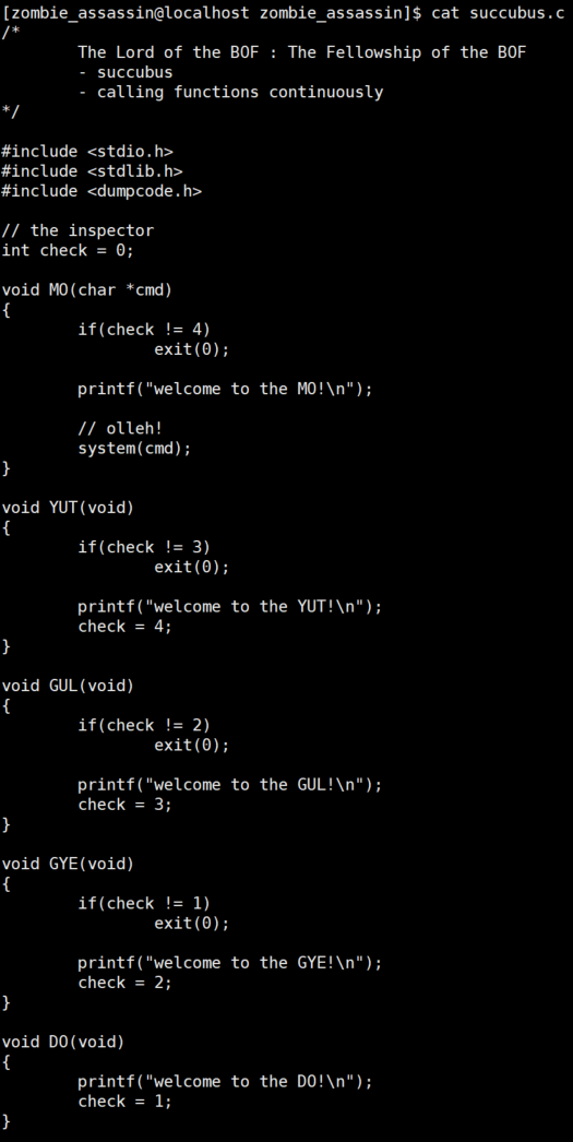 하지만 check 변수를 체크하여 종료된다. 따라서 check 변수를 4로 설정할 필요가 있다. check 변수는 전역변수이므로 stack overflow로는 조작할 수 없다. 다른 함수들이 check 변수를 조작하므로, 이를 이용하여 check 변수를 4로 만들어야 한다.